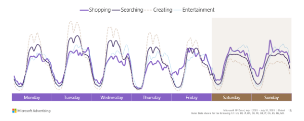 Microsoft users are typically employed and affluent, making them attractive for advertisers in higher-consideration categories. While shopping and entertainment activity usually peaks on weekends, usage is spread across the workweek, signalling that discovery, planning and decision-making now happen continuously, not just during traditional leisure windows.